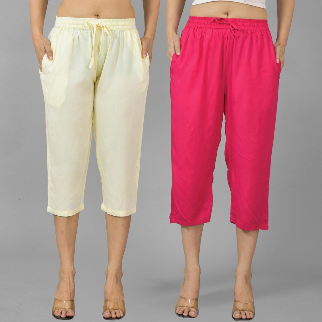 Pack Of 2 Womens Beige And Rani Pink Calf Length Rayon Culottes Trouser Combo