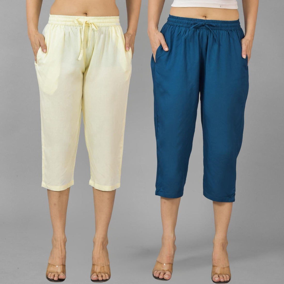 Pack Of 2 Womens Beige And Teal Blue Calf Length Rayon Culottes Trouser Combo