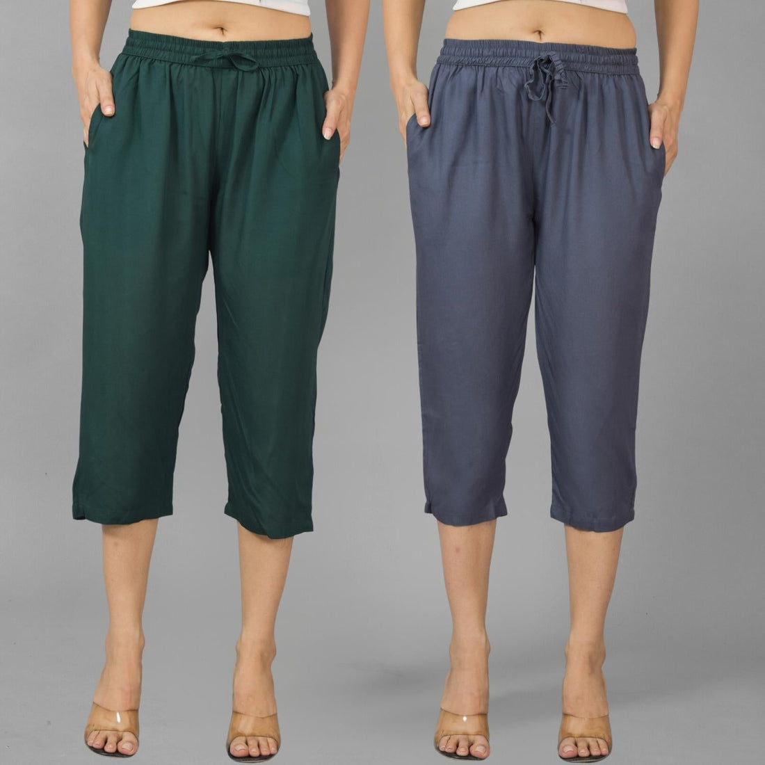 Pack Of 2 Womens Dark Green And Dark Grey Calf Length Rayon Culottes Trouser Combo
