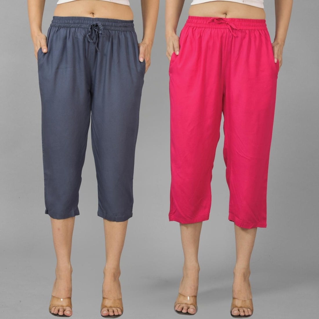 Pack Of 2 Womens Dark Grey And Rani Pink Calf Length Rayon Culottes Trouser Combo
