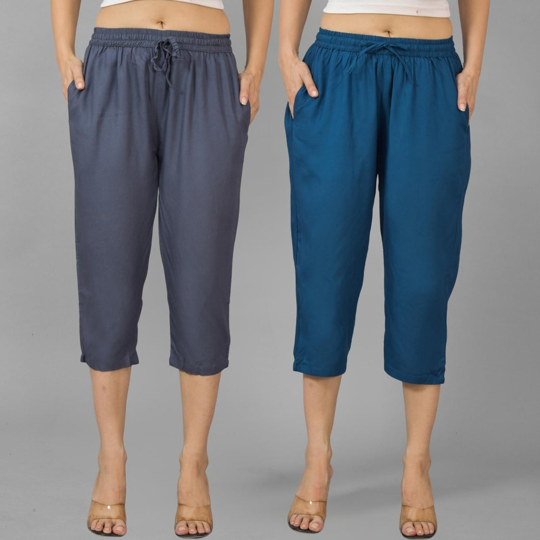 Pack Of 2 Womens Dark Grey And Teal Blue Calf Length Rayon Culottes Trouser Combo