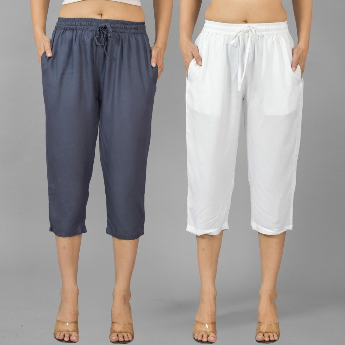 Pack Of 2 Womens Dark Grey And White Calf Length Rayon Culottes Trouser Combo
