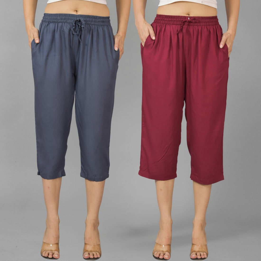 Pack Of 2 Womens Dark Grey And Wine Calf Length Rayon Culottes Trouser Combo
