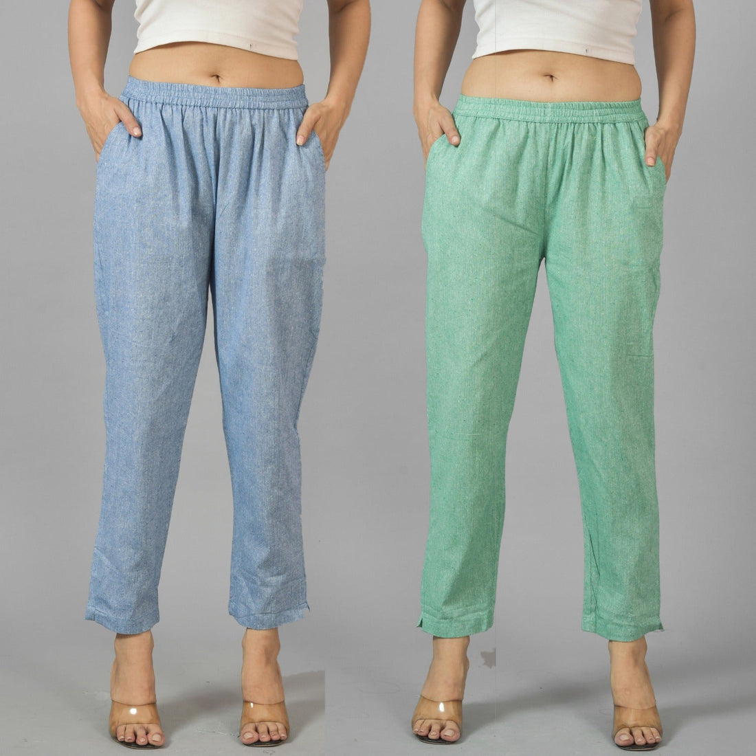 Pack Of 2 Womens Denim Blue and Green Fully Elastic Cotton Trousers
