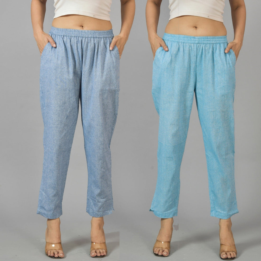 Pack Of 2 Womens Denim Blue and Sky Blue Fully Elastic Cotton Trousers