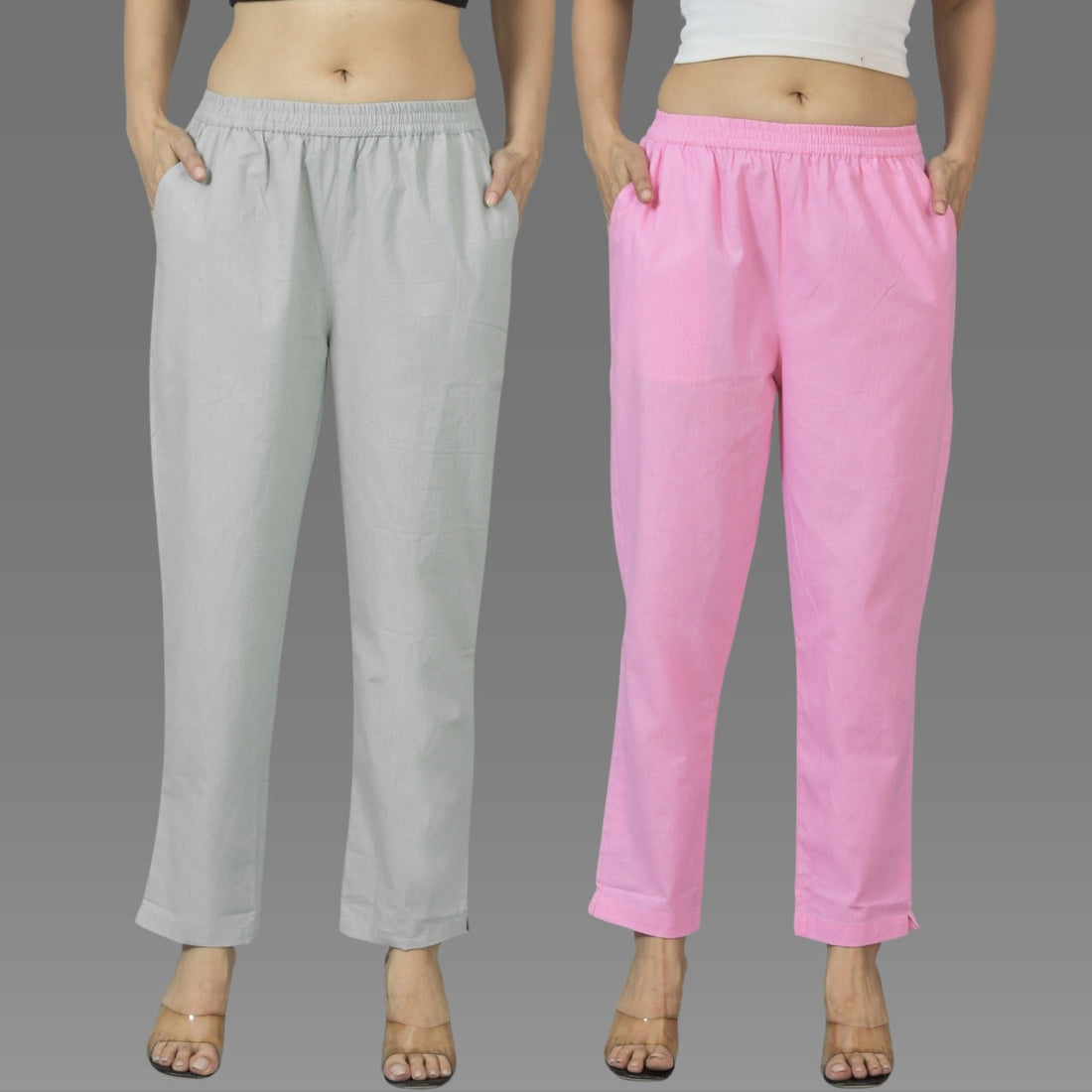 Pack Of 2 Womens Melange Grey And Pink Deep Pocket Fully Elastic Cotton Trouser