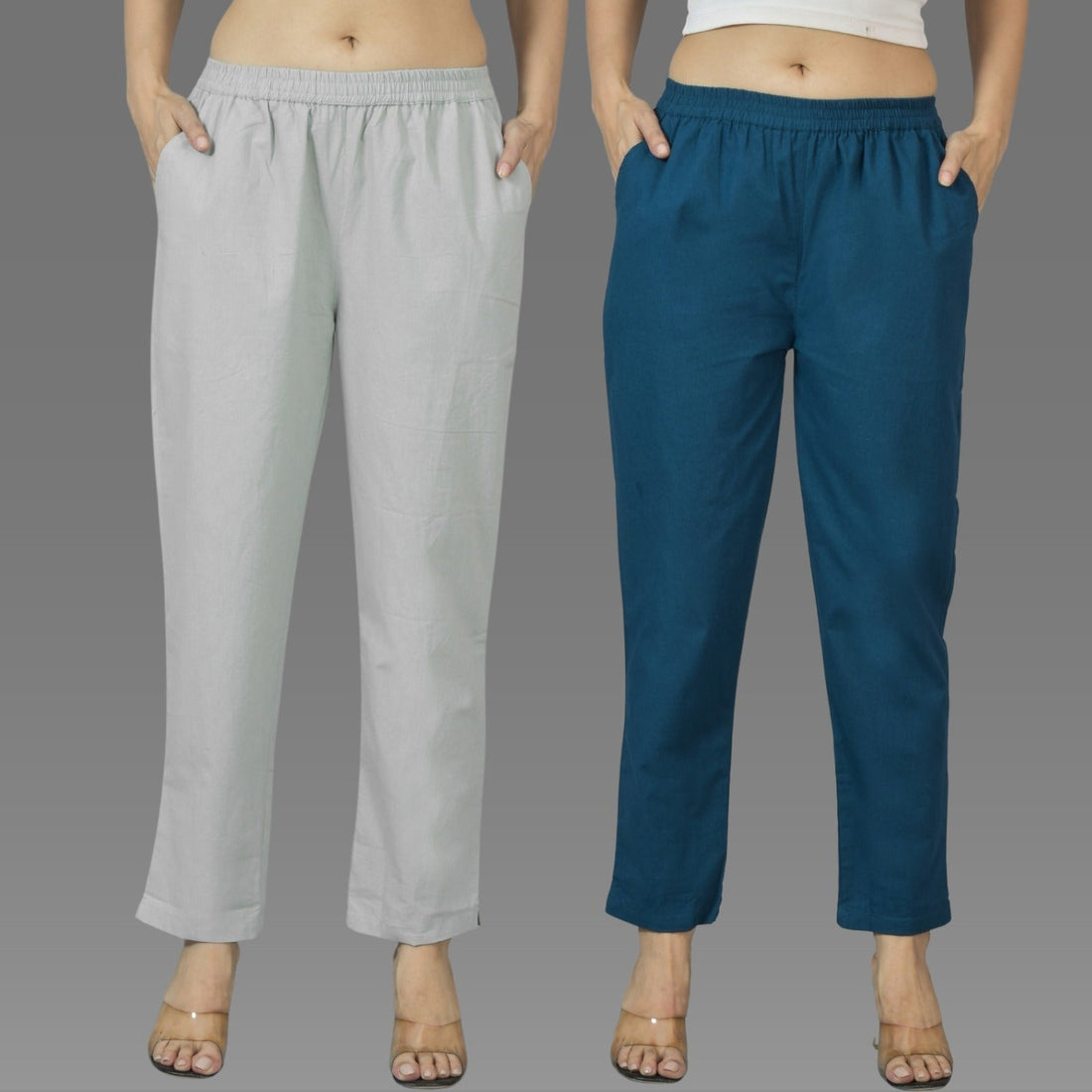 Pack Of 2 Womens Melange Grey And Teal Blue Deep Pocket Fully Elastic Cotton Trouser