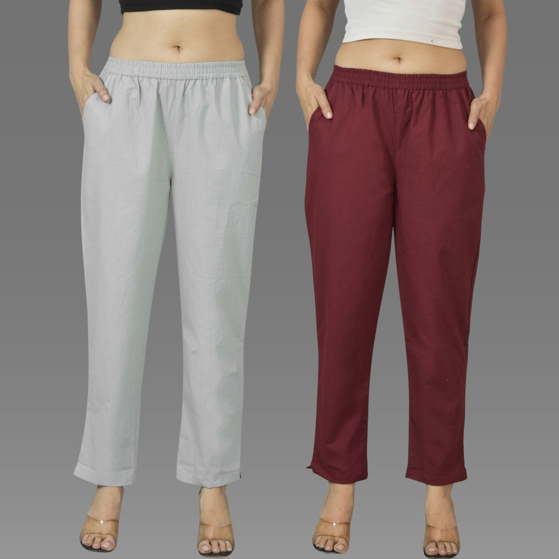 Pack Of 2 Womens Melange Grey And Wine Deep Pocket Fully Elastic Cotton Trouser