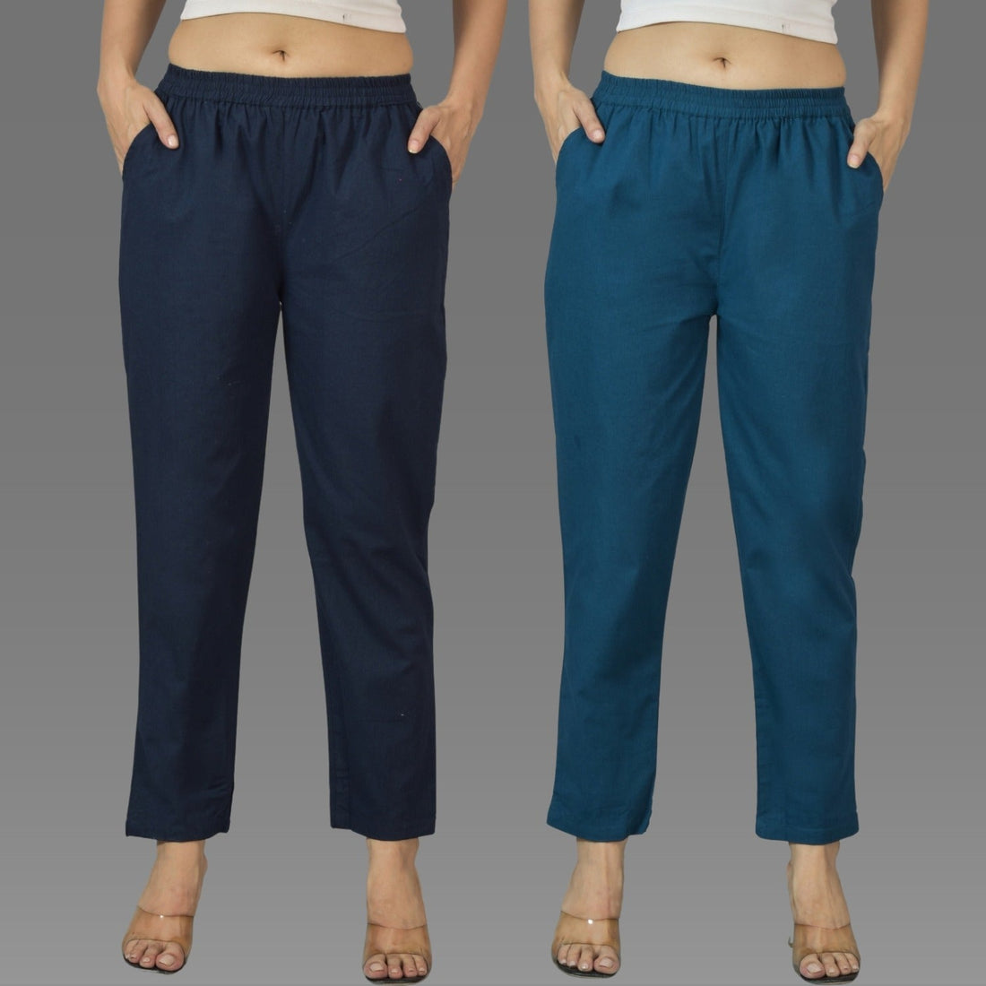 Pack Of 2 Womens Navy Blue And Teal Blue Deep Pocket Fully Elastic Cotton Trouser