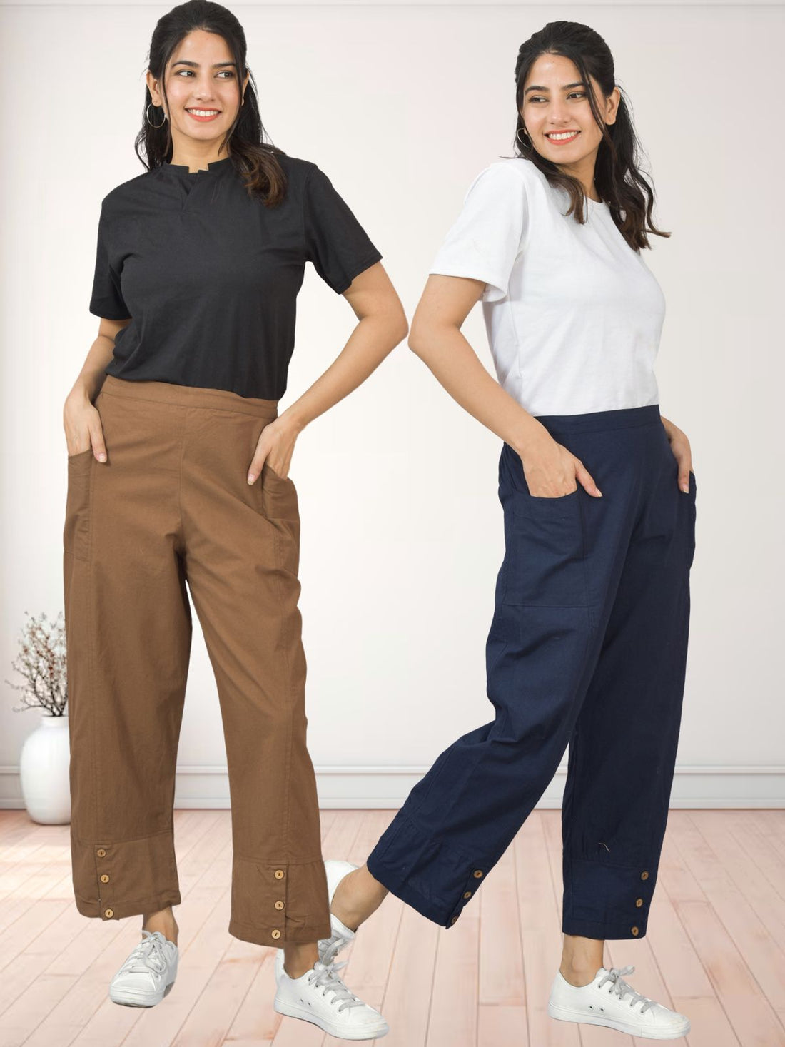 Combo Pack Of Womens Brown And Navy Blue Side Pocket Straight Cargo Pants