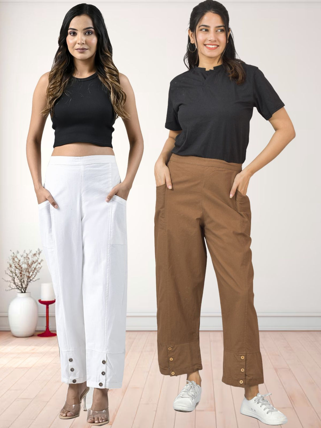 Combo Pack Of Womens White And Brown Side Pocket Straight Cargo Pants