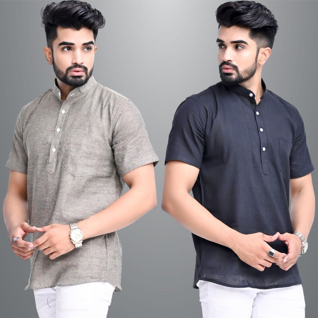 Mens Regular Fit Biscuit Grey and Black Half Sleeve Cotton Short Kurta Combo
