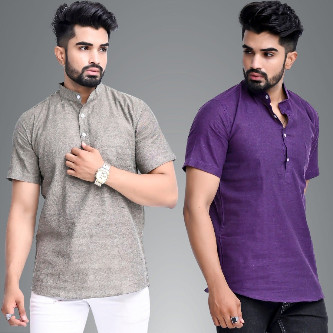 Mens Regular Fit Biscuit Grey and Dark Purple Half Sleeve Cotton Short Kurta Combo