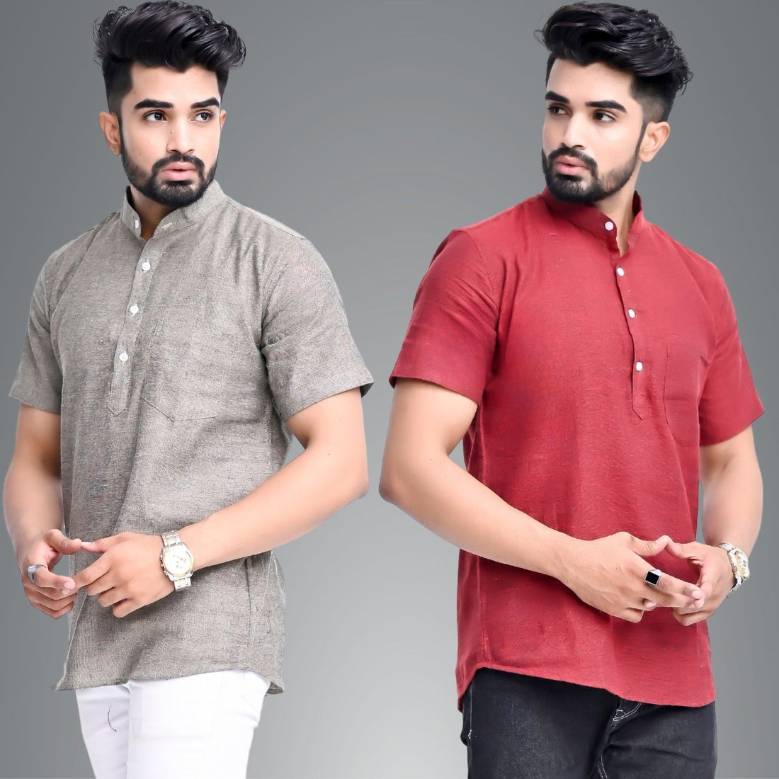 Mens Regular Fit Biscuit Grey and Maroon Half Sleeve Cotton Short Kurta Combo