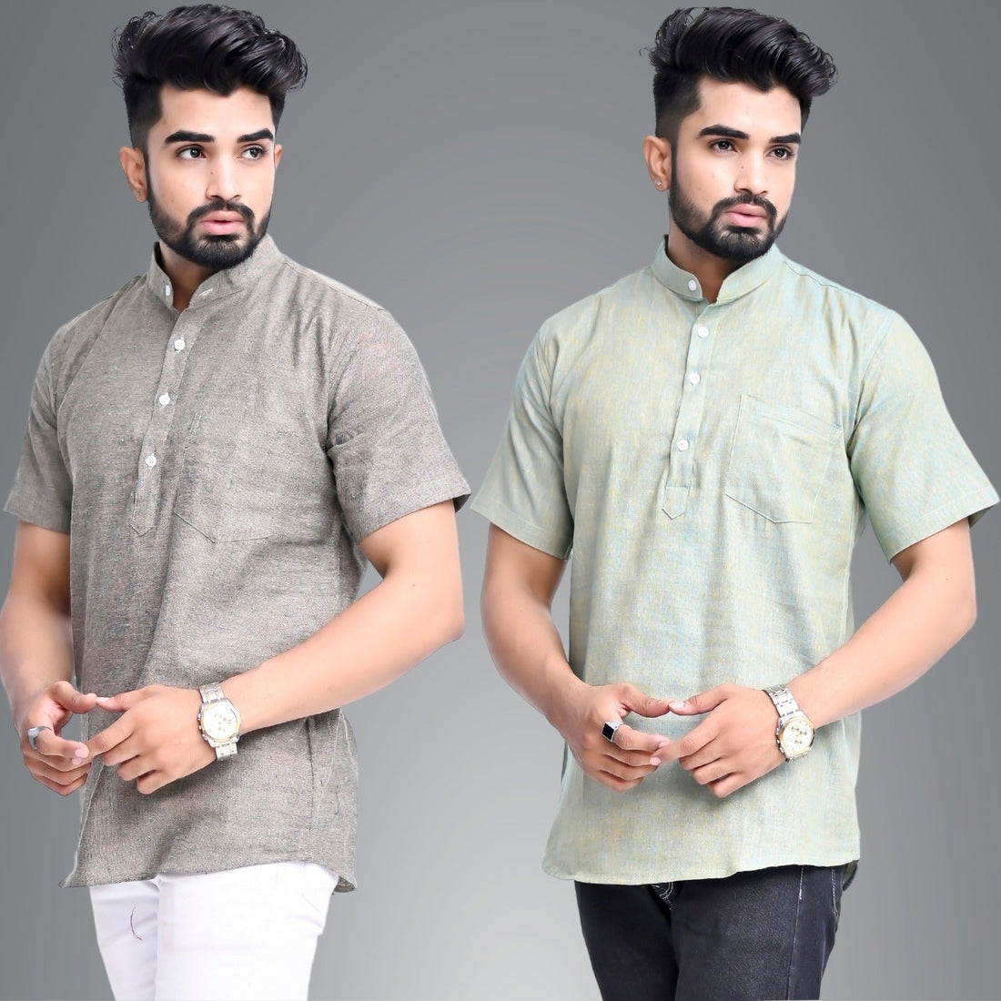 Mens Regular Fit Biscuit Grey and Parrot Green Half Sleeve Cotton Short Kurta Combo