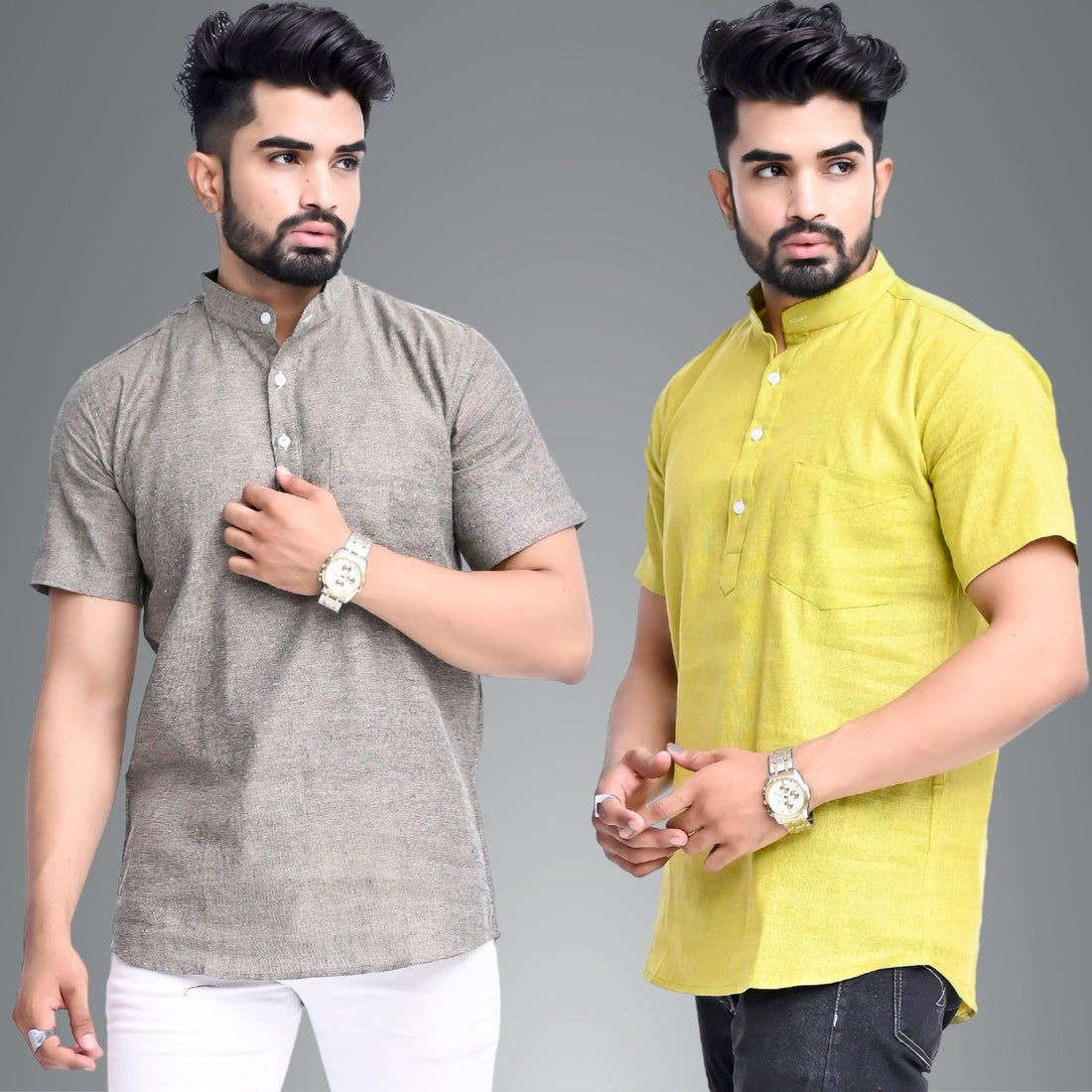 Mens Regular Fit Biscuit Grey and Mustard Half Sleeve Cotton Short Kurta Combo