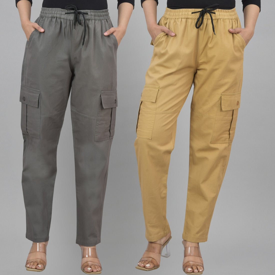 Pack Of 2 Womens Khaki And Melange Grey 5 Pocket Twill Straight Cargo Pants