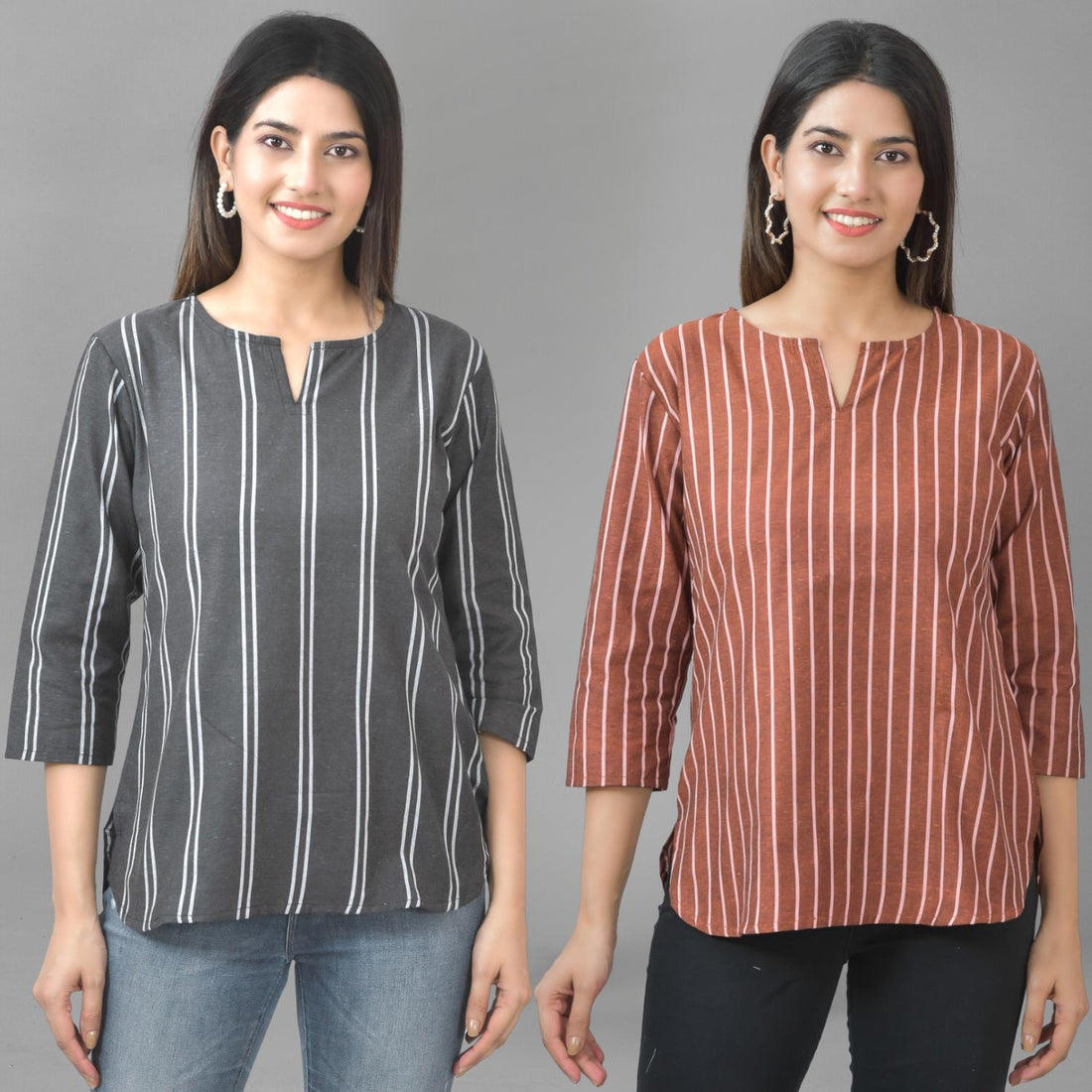 Pack Of 2 Black And Brown Striped Cotton Womens Top Combo
