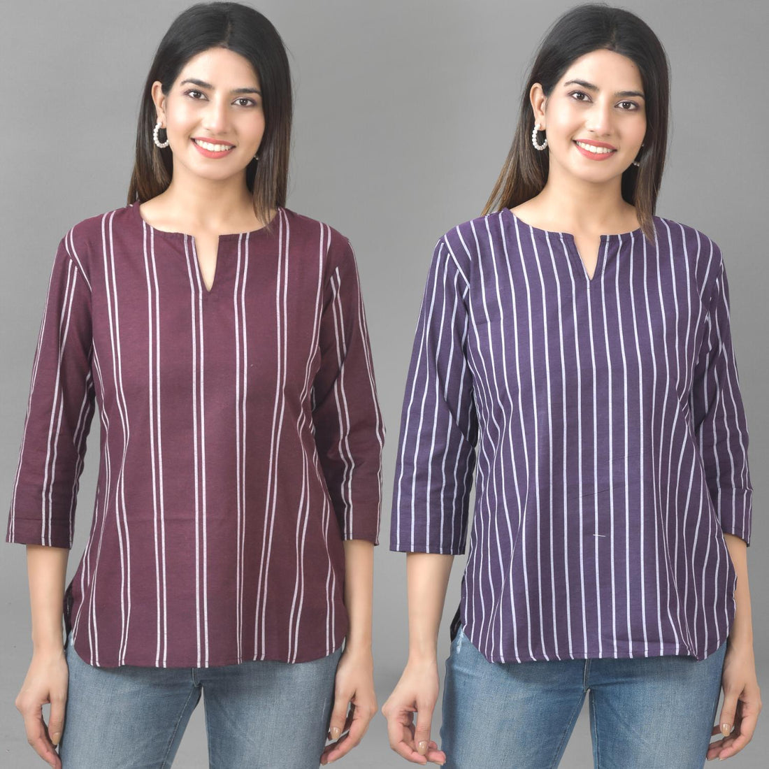 Pack Of 2 Coffee And Dark Purple Striped Cotton Womens Top Combo