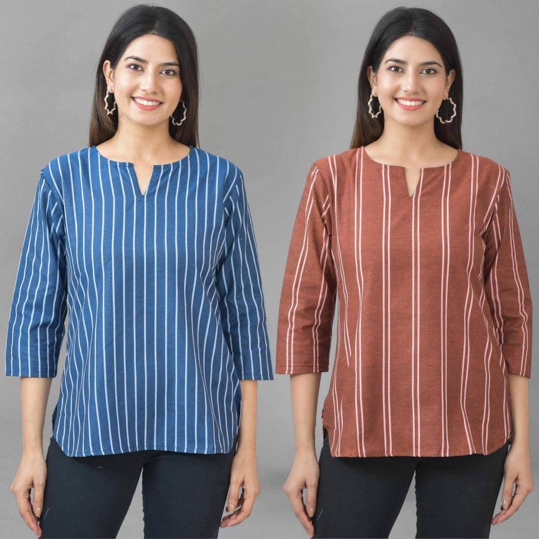 Pack Of 2 Dark Blue And Dark Coffee Striped Cotton Womens Top Combo