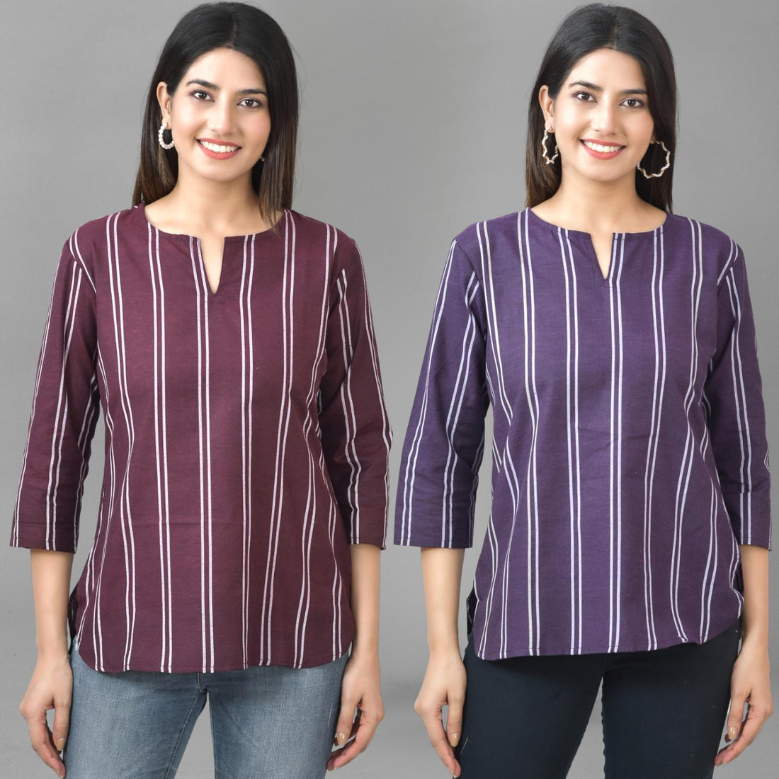 Pack Of 2 Coffee And Purple Striped Cotton Womens Top Combo