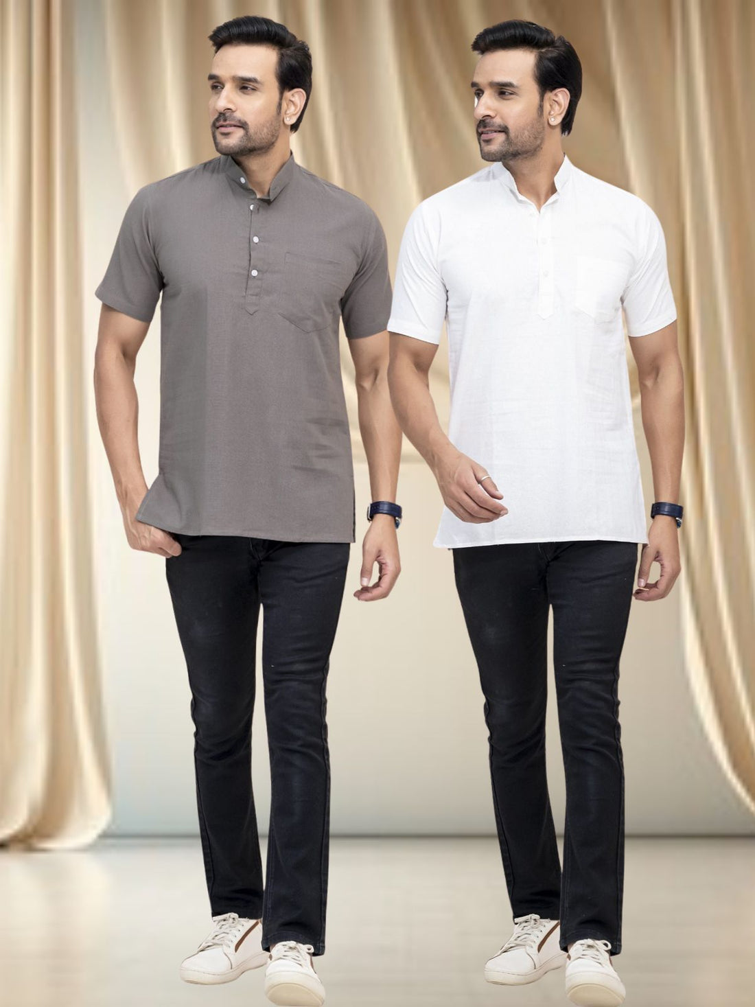 Pack Of 2 Mens Grey And White Cotton Short Kurta Combo