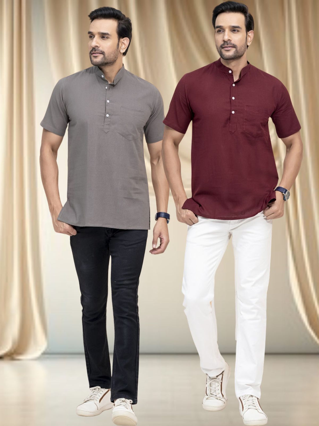 Pack Of 2 Mens Grey And Wine Cotton Short Kurta Combo