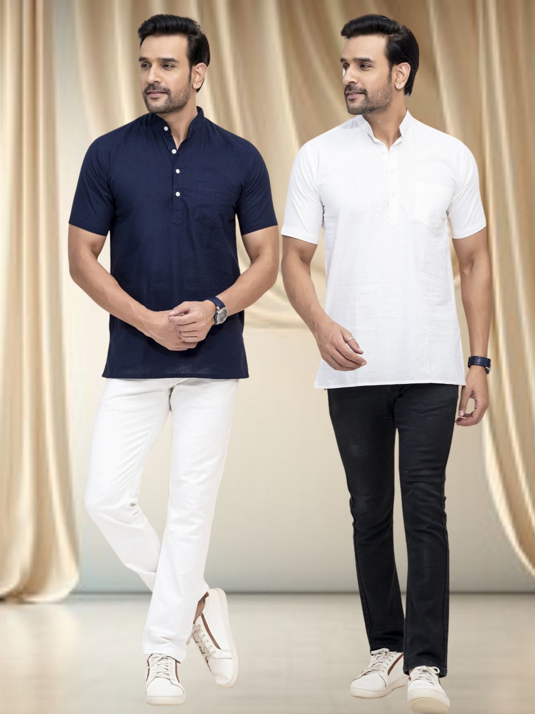 Pack Of 2 Mens Navy Blue And White Cotton Short Kurta Combo