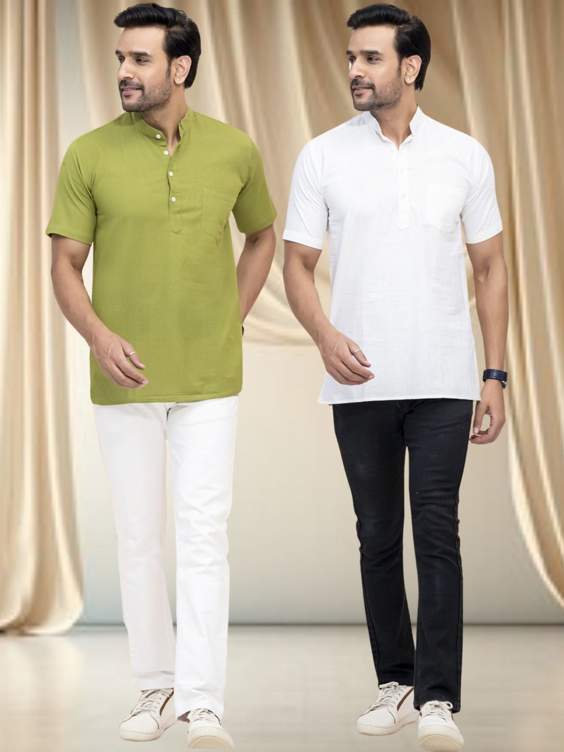 Pack Of 2 Mens Olive Green And White Cotton Short Kurta Combo