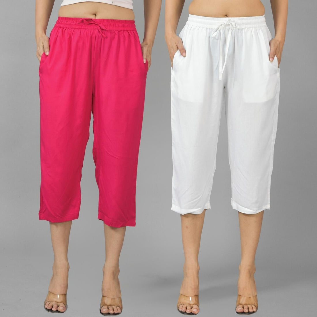 Pack Of 2 Women Rani Pink And White Calf Length Rayon Culottes Trouser Combo