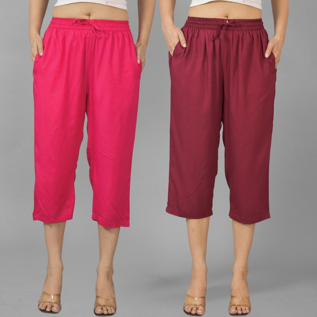 Pack Of 2 Women Rani Pink And Wine Calf Length Rayon Culottes Trouser Combo