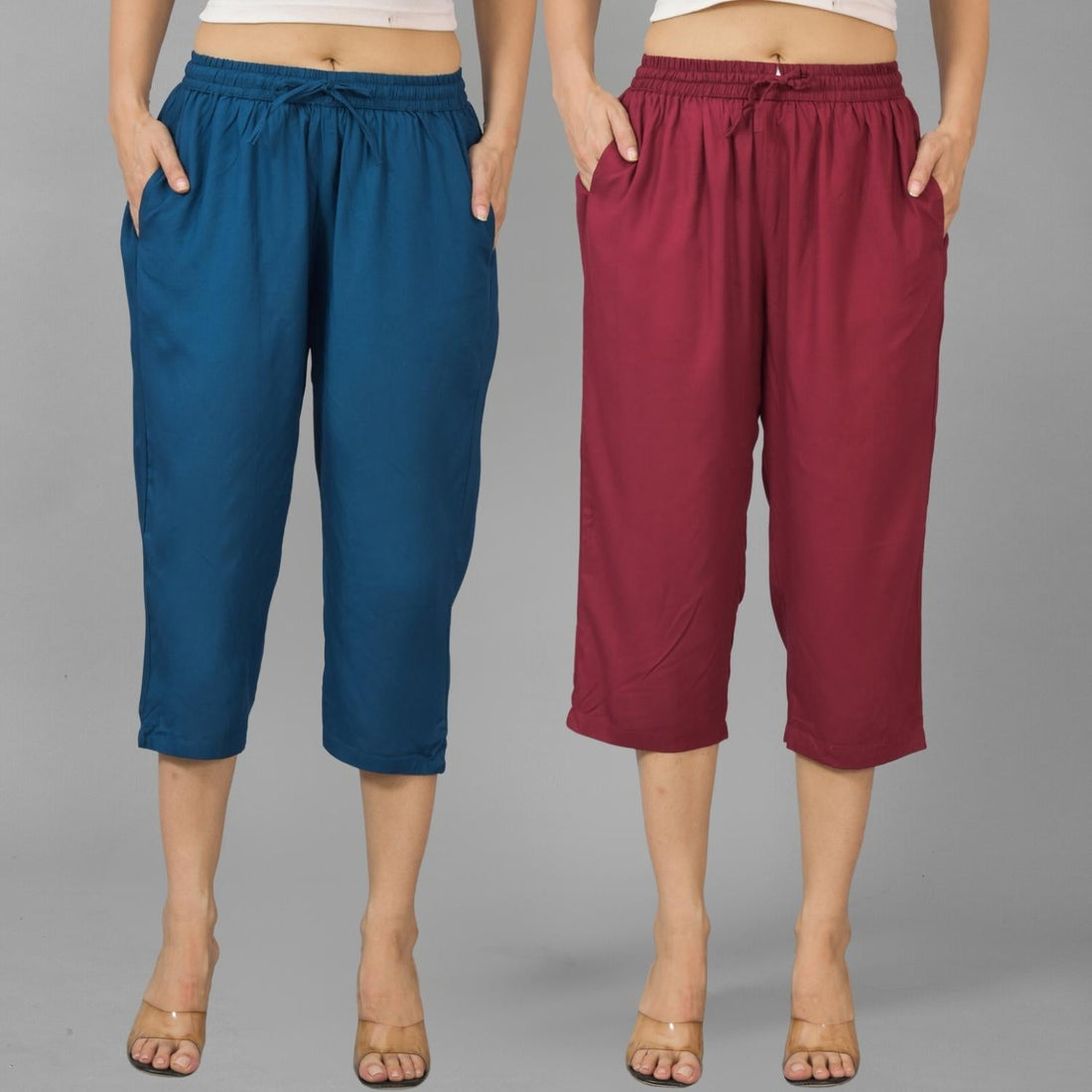 Pack Of 2 Women Teal Blue And Wine Calf Length Rayon Culottes Trouser Combo