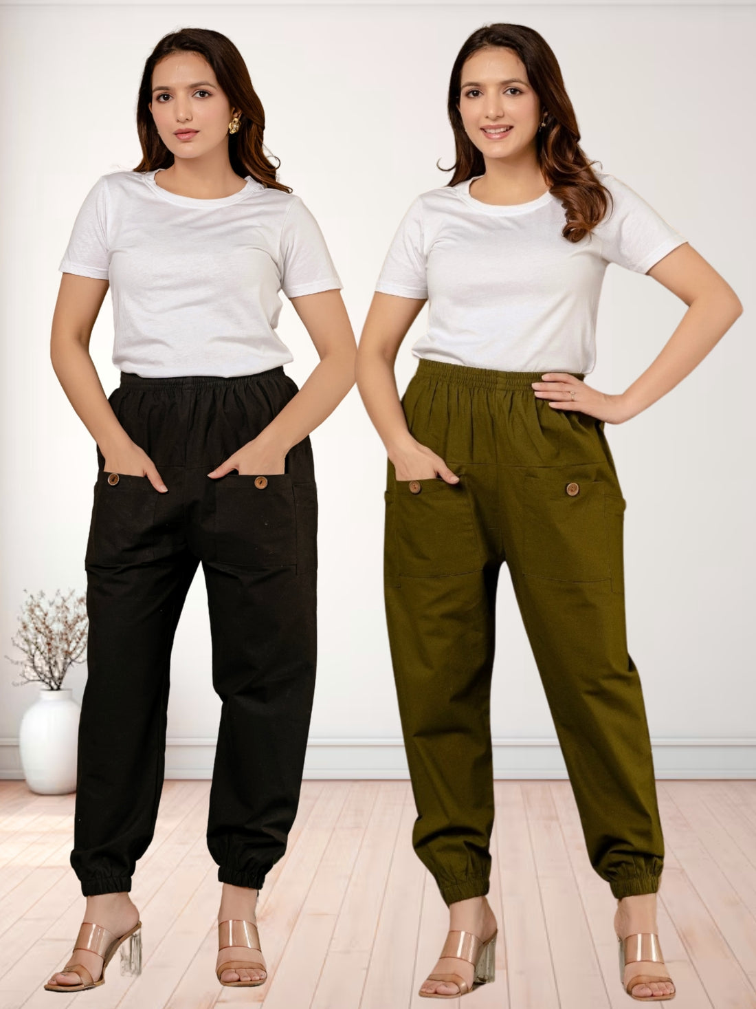 Combo Pack Of Womens Black And Dark Green Four Pocket Cotton Cargo Pants