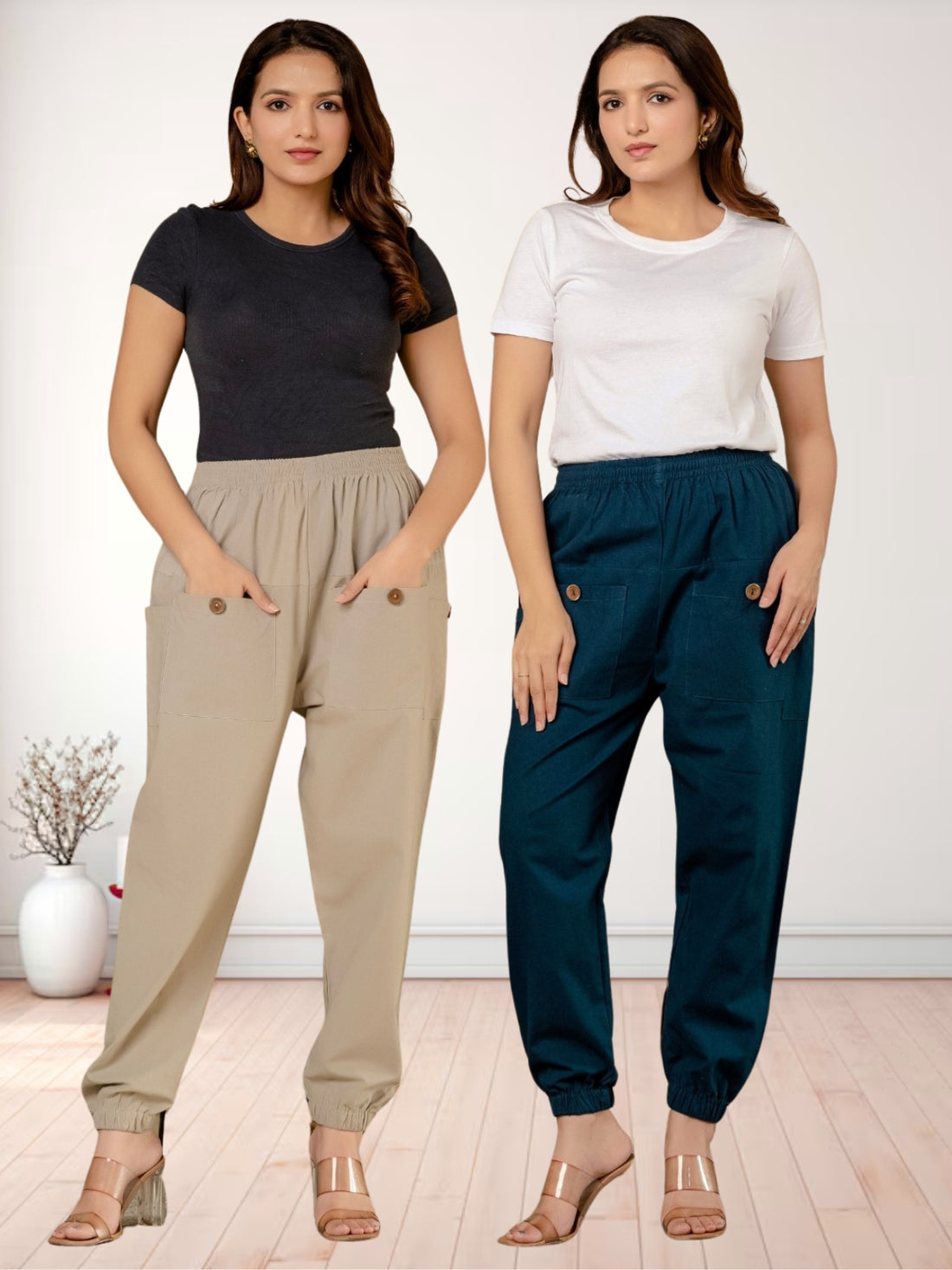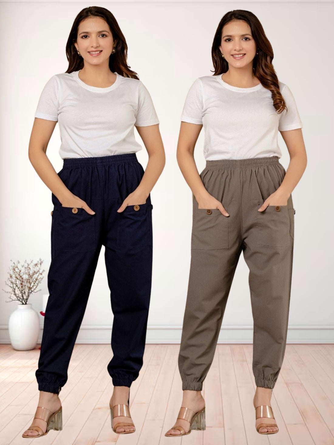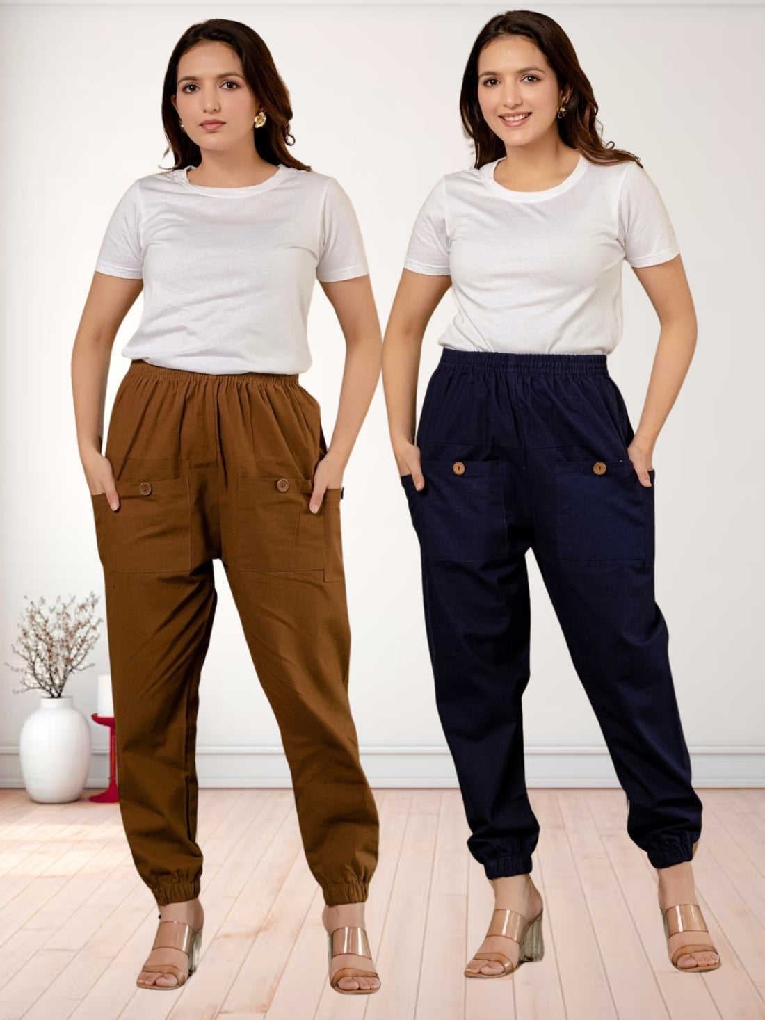 Combo Pack Of Womens Brown And Dark Blue Four Pocket Cotton Cargo Pants