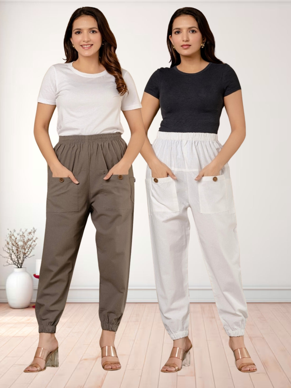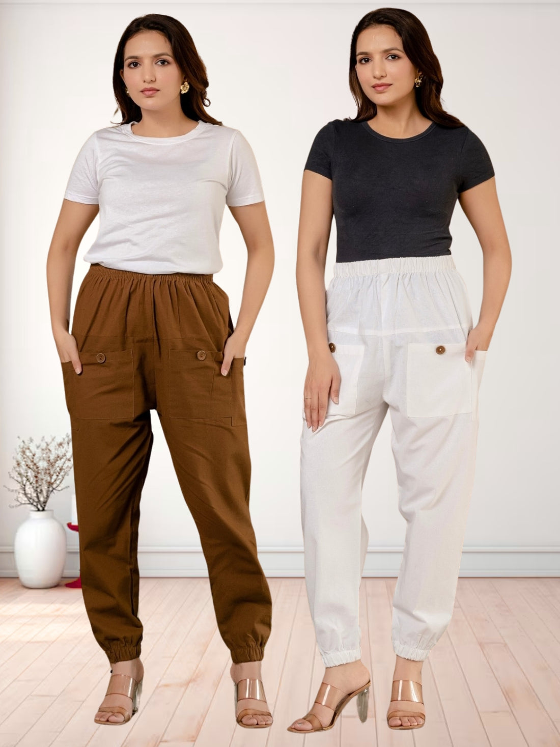 Combo Pack Of Womens Brown And White Four Pocket Cotton Cargo Pants