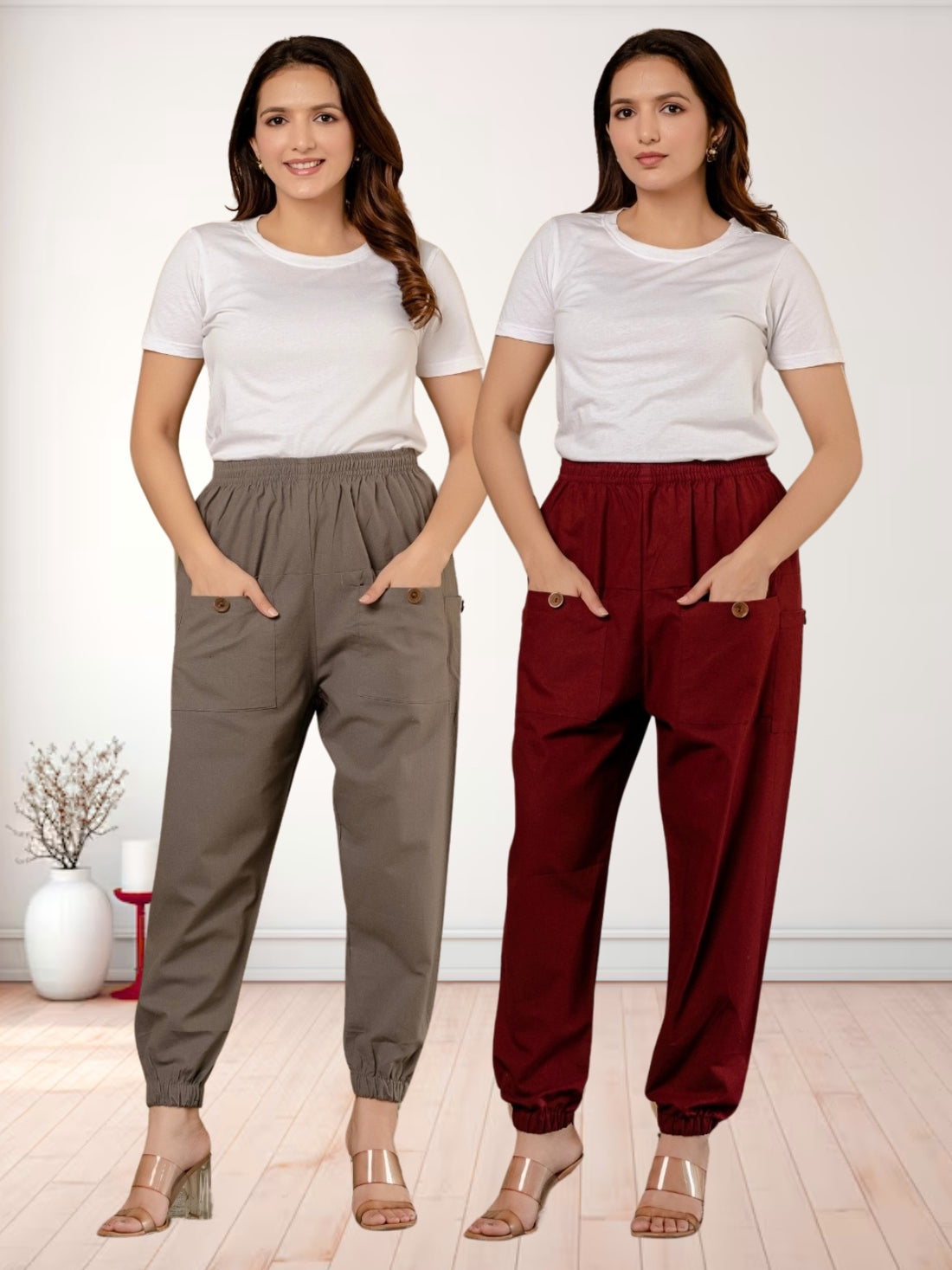 Combo Pack Of Womens Grey And Maroon Four Pocket Cotton Cargo Pants
