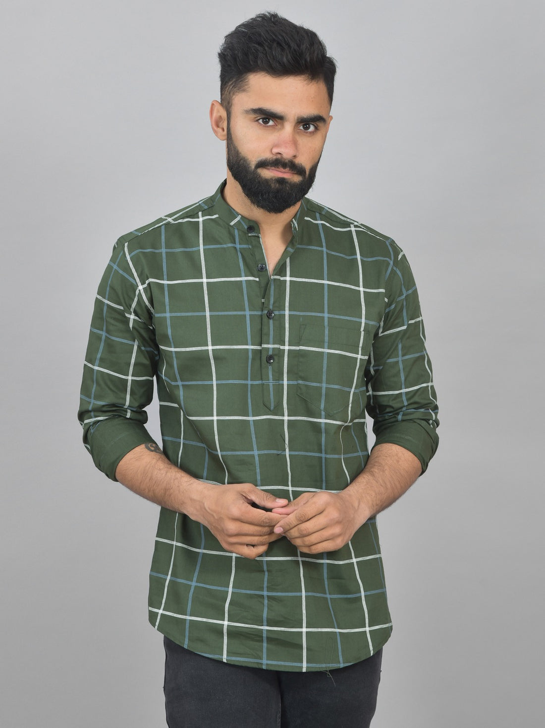 Quaclo Mens Green Check Cotton Short Kurta