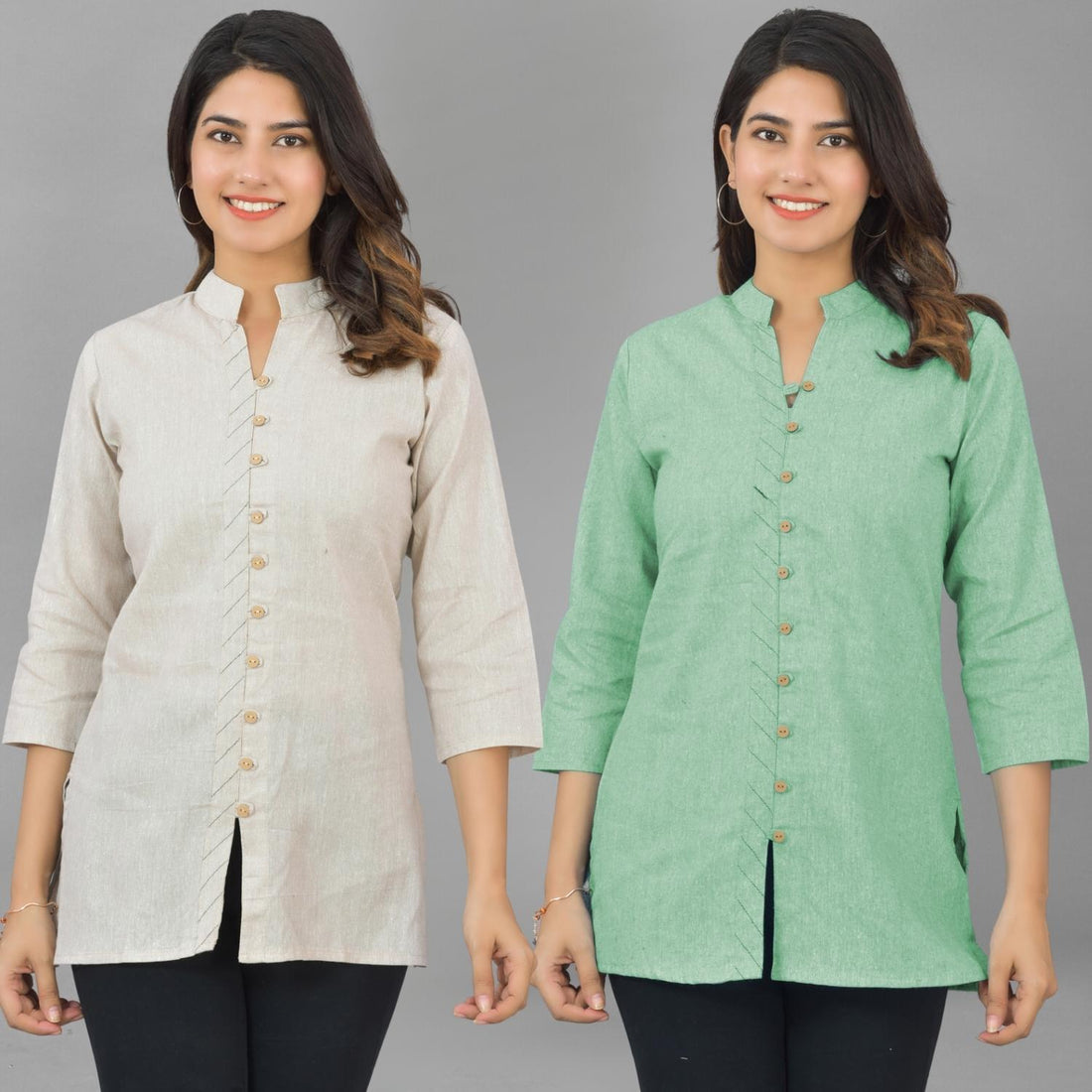 Pack Of 2 Womens Cream And Green Woven Design Handloom Cotton Frontslit Short Kurtis
