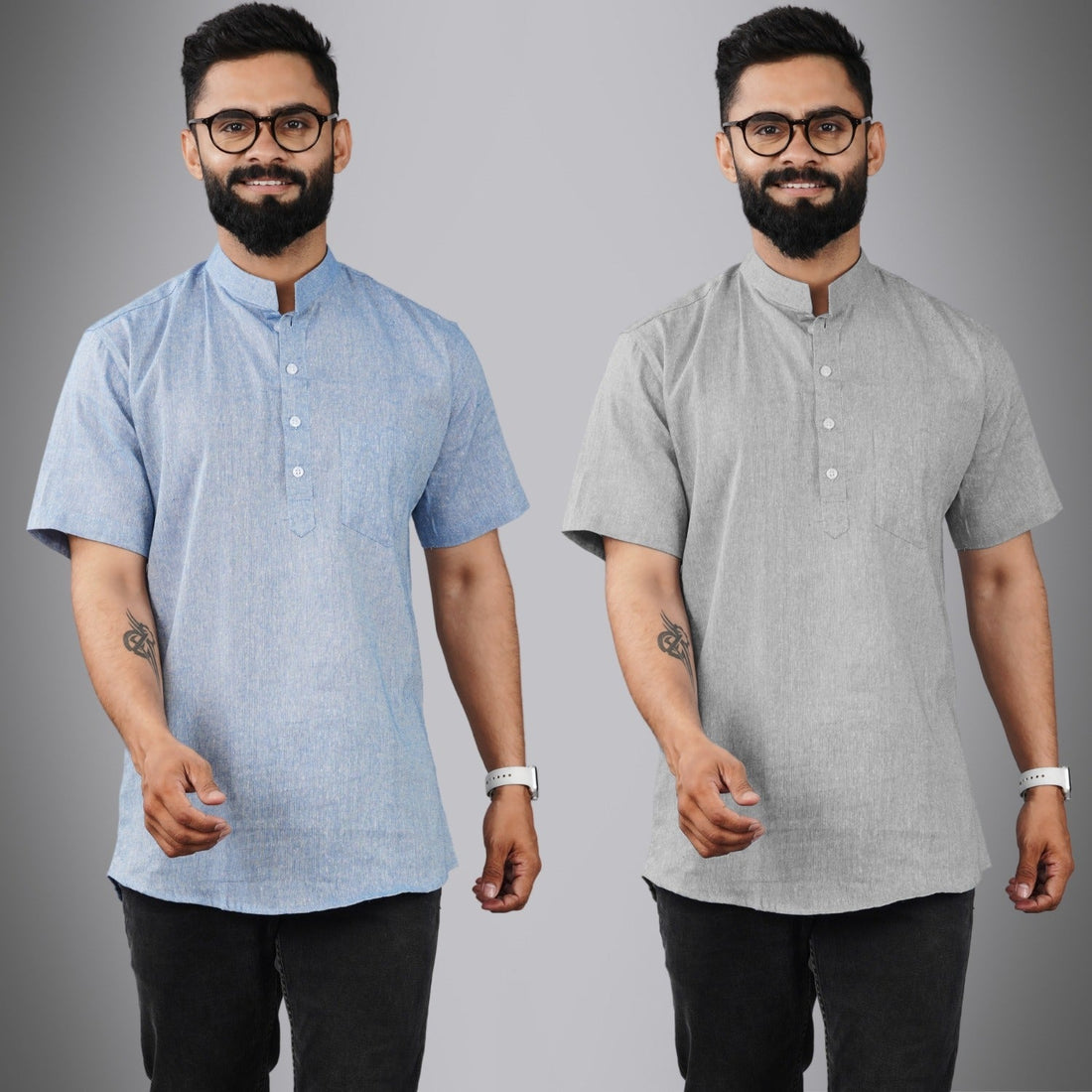 Pack Of 2 Mens Regular Fit Blue And Grey Half Sleeve Cotton Short Kurta Combo