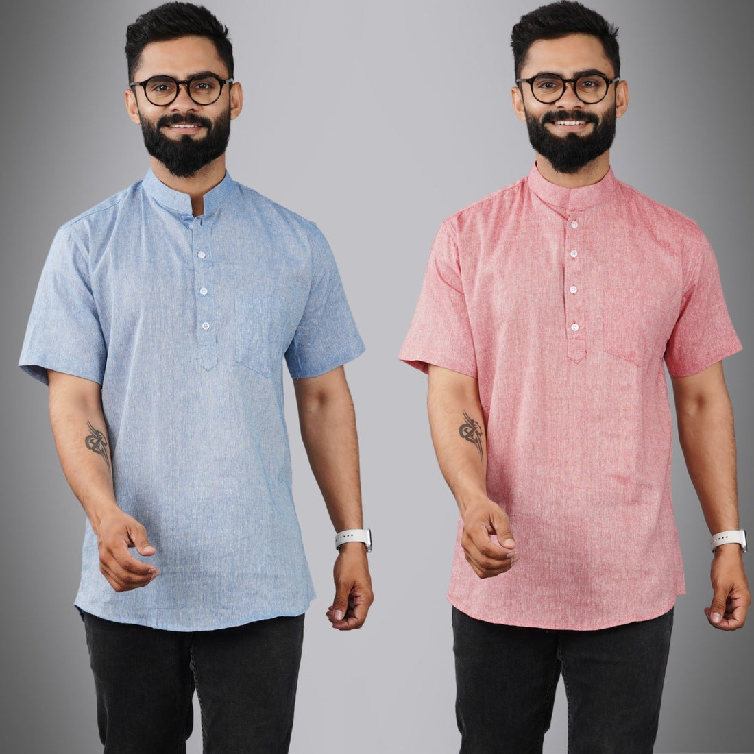 Pack of 2 Mens Solid Pink And Sky Blue Khadi Cotton Short Kurta Combo