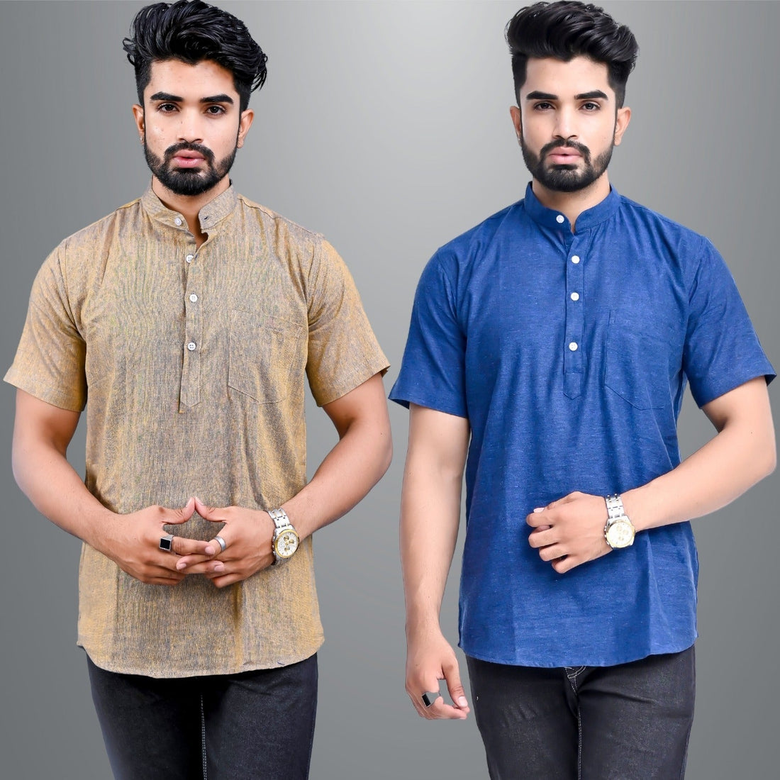 Mens Regular Fit Brown and Dark Blue Half Sleeve Cotton Short Kurta Combo