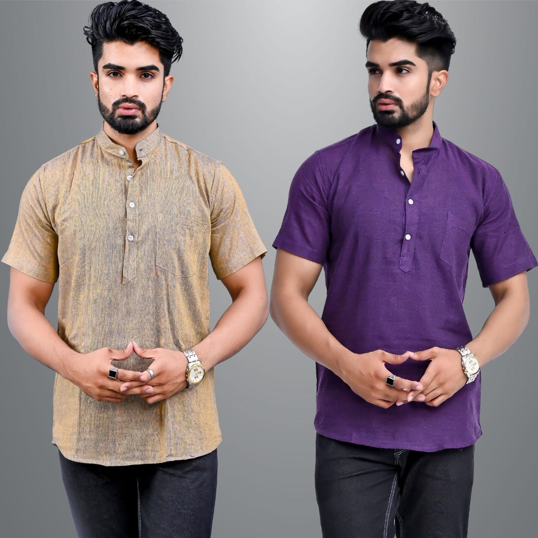 Mens Regular Fit Brown and Dark Purple Half Sleeve Cotton Short Kurta Combo