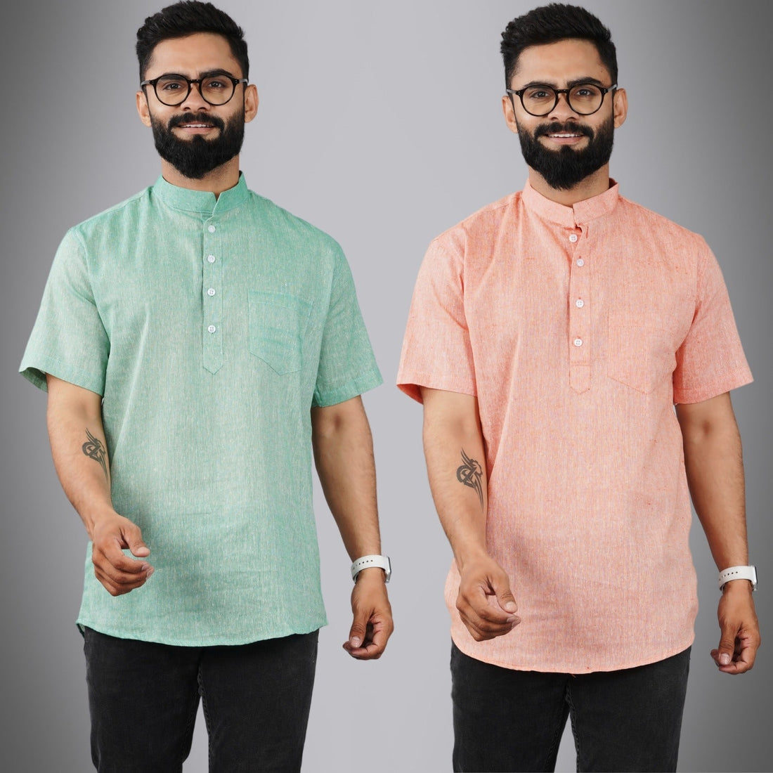 Pack Of 2 Mens Regular Fit Green And Orange Half Sleeve Cotton Short Kurta Combo