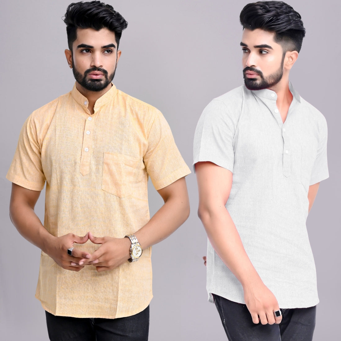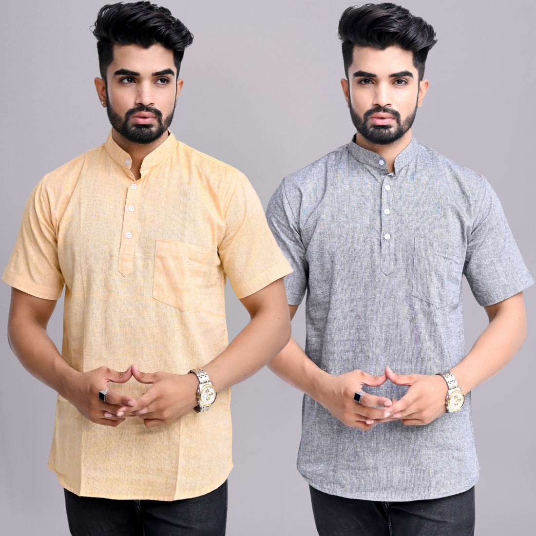 Pack of 2 Mens Solid Beige And Grey Khadi Cotton Short Kurta Combo