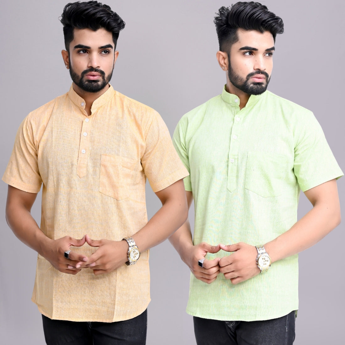 Pack of 2 Mens Solid Beige And Parrot Green Khadi Cotton Short Kurta Combo