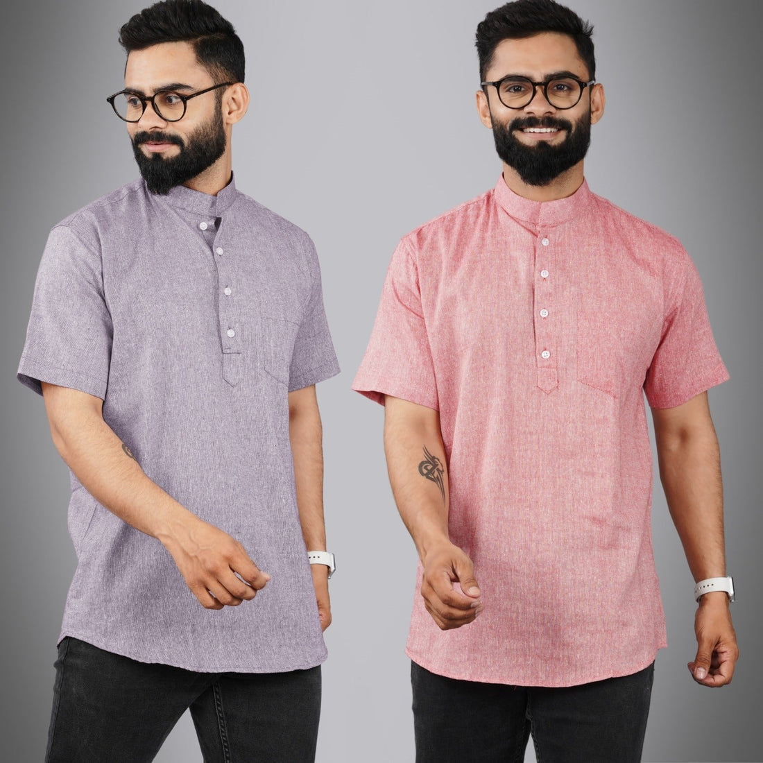 Pack Of 2 Mens Regular Fit Purple And Red Half Sleeve Cotton Short Kurta Combo