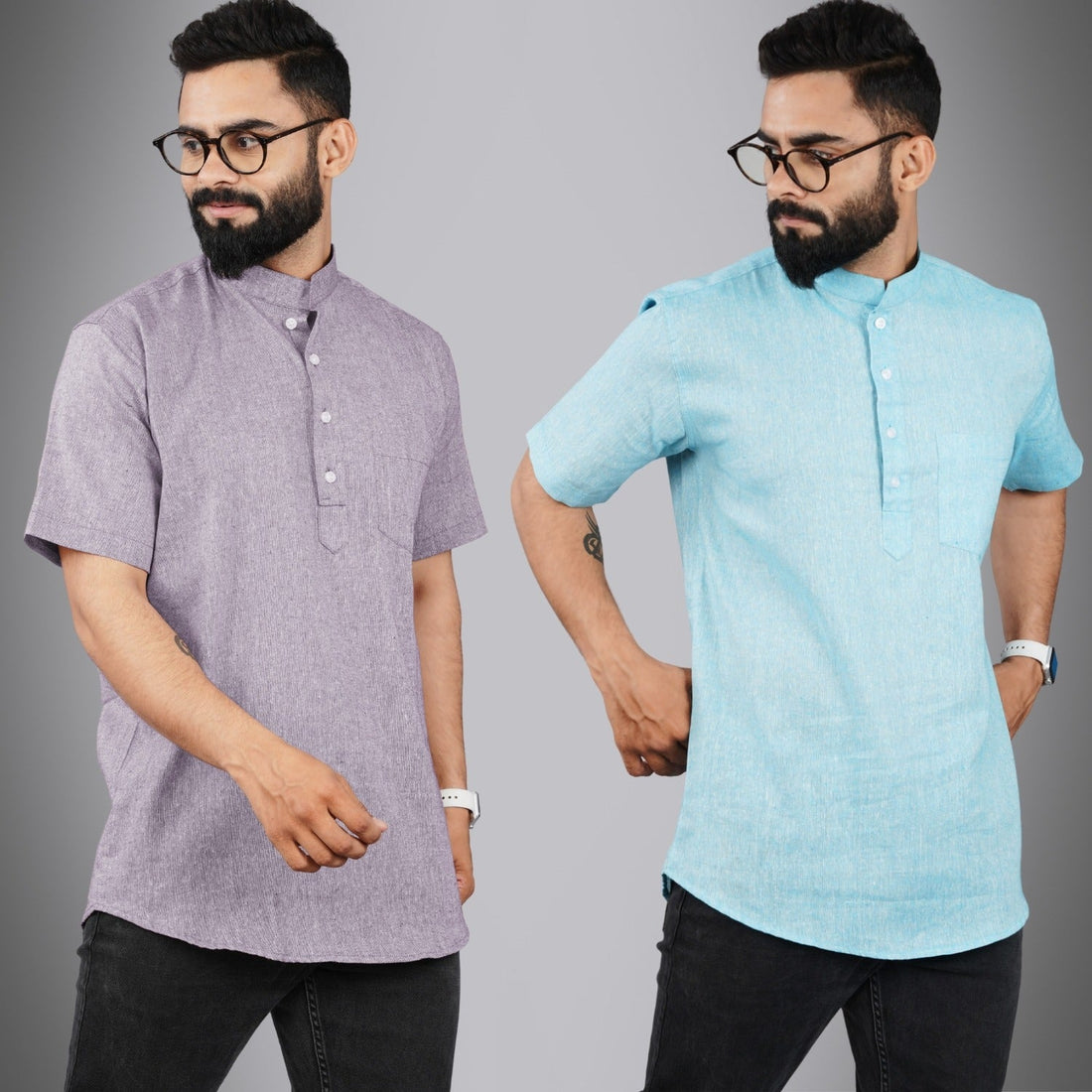 Pack Of 2 Mens Regular Fit Purple And Sky Blue Half Sleeve Cotton Short Kurta Combo