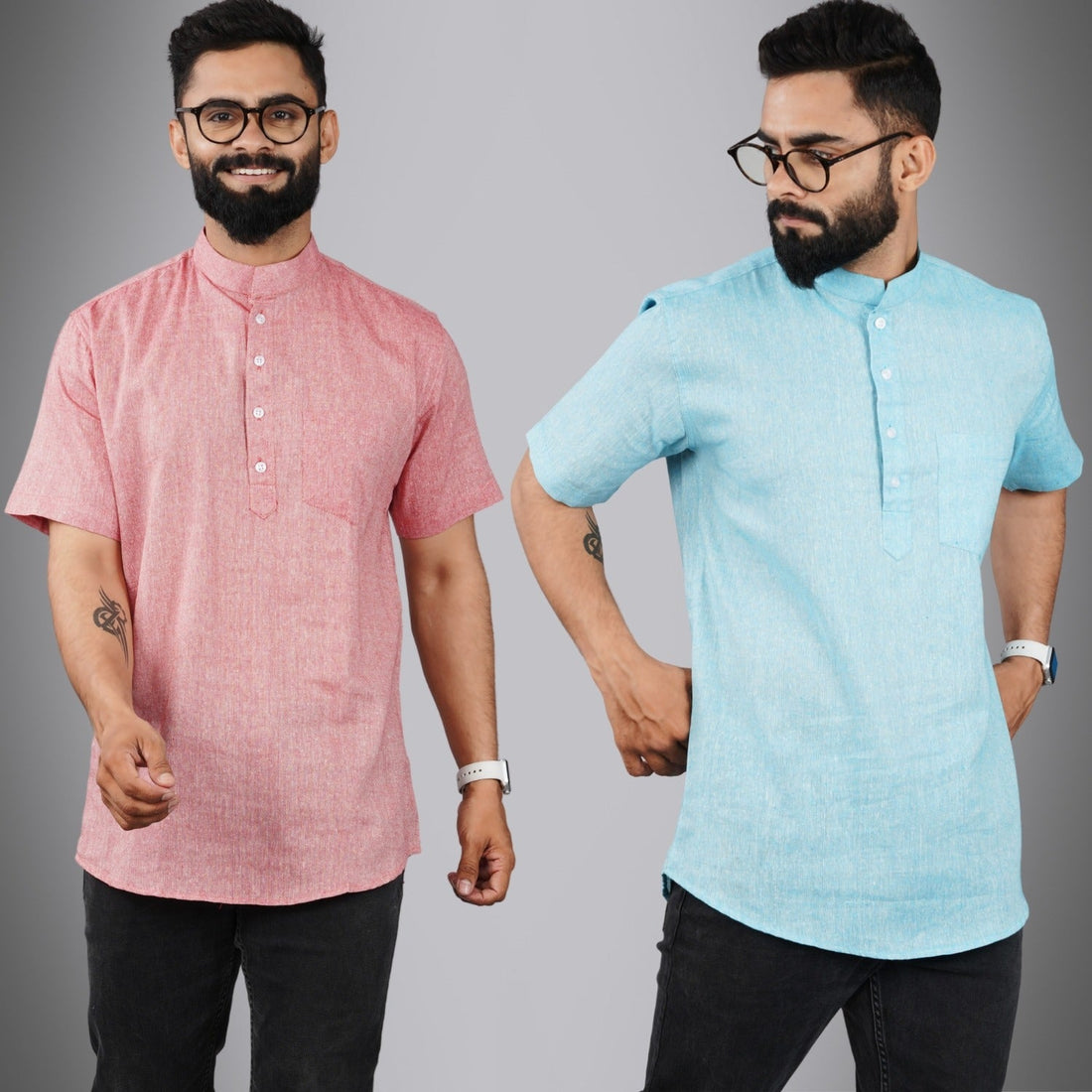 Pack Of 2 Mens Regular Fit Pink And Sky Blue Half Sleeve Cotton Short Kurta Combo