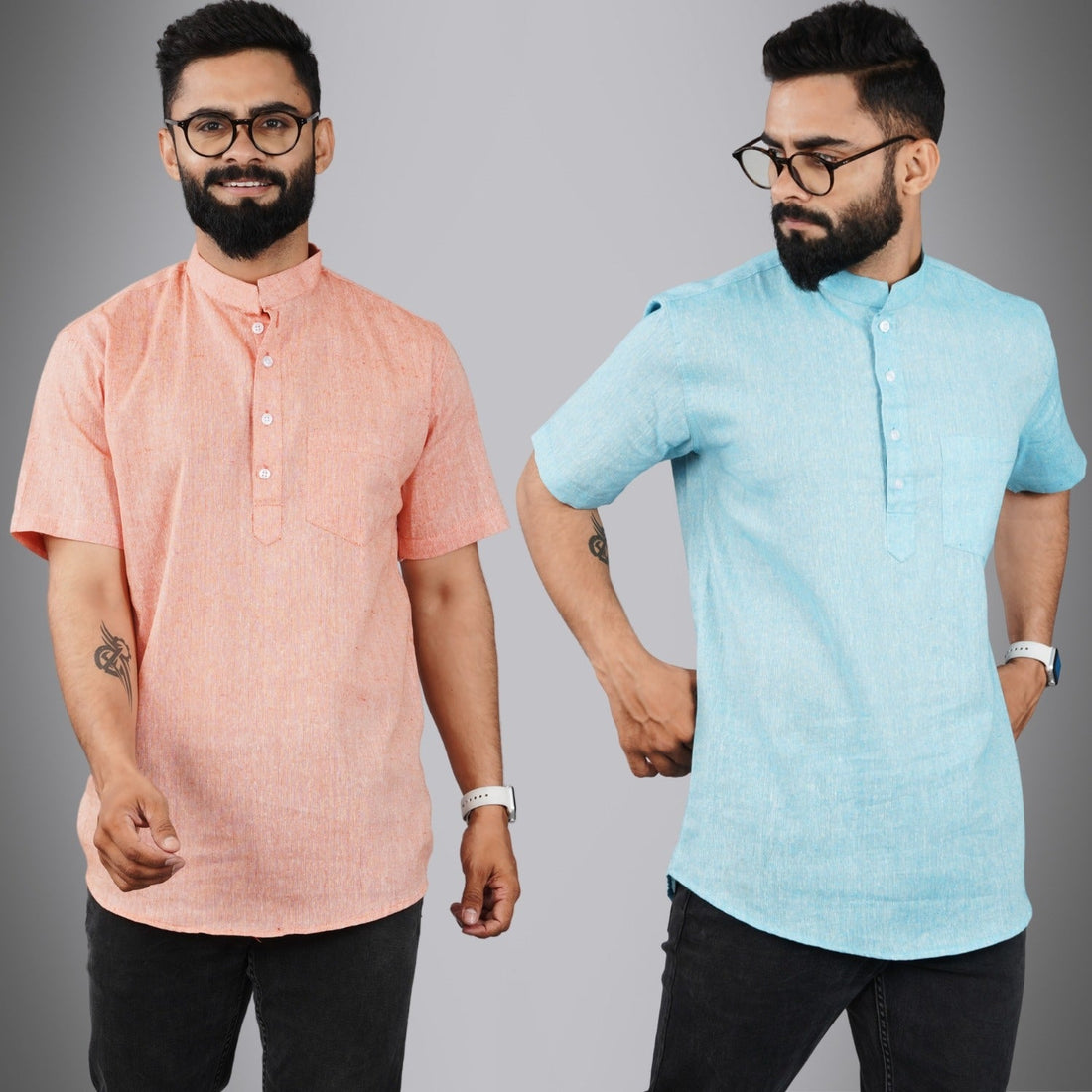 Pack Of 2 Mens Regular Fit Orange And Sky Blue Half Sleeve Cotton Short Kurta Combo