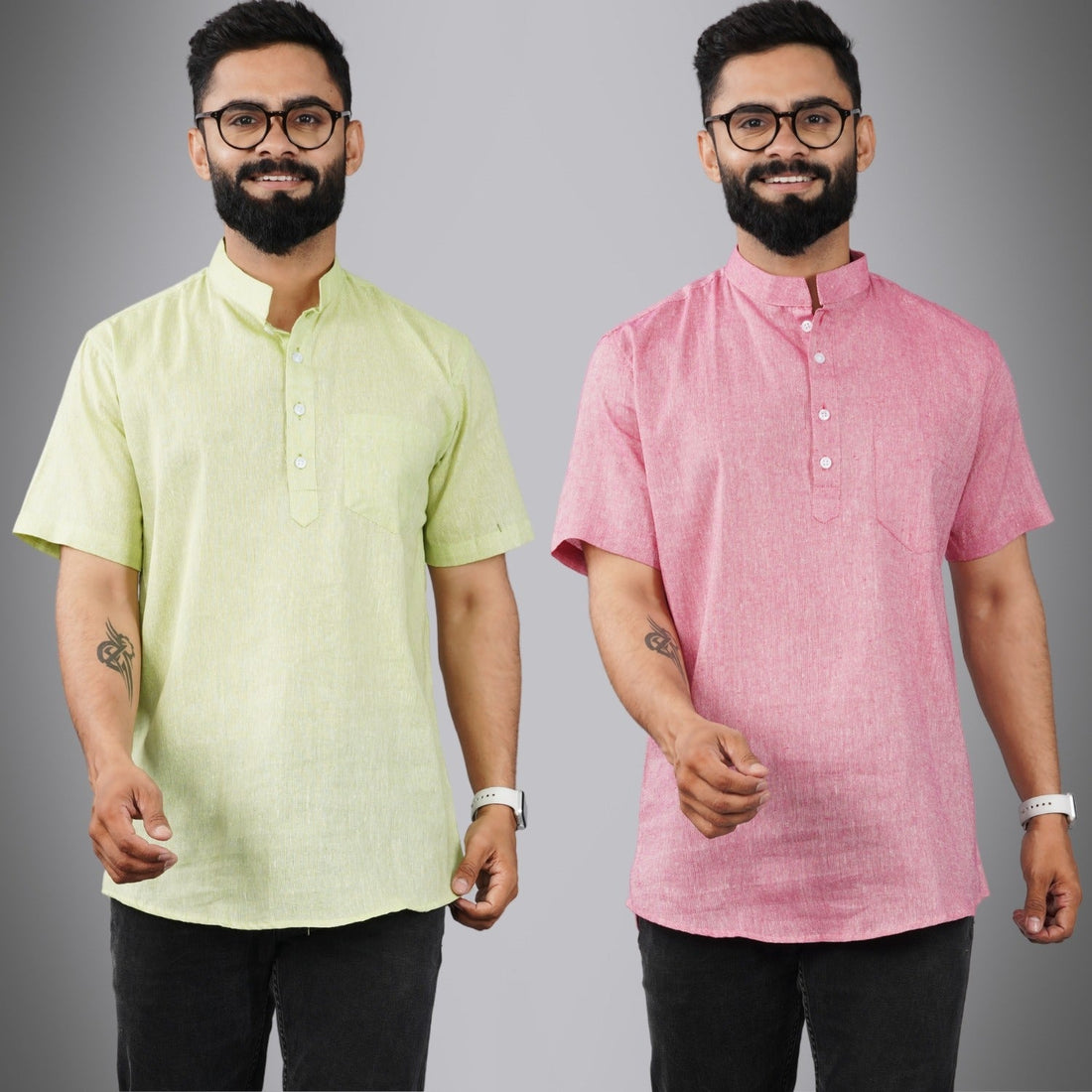 Pack Of 2 Mens Regular Fit Parrot Green And Pink Half Sleeve Cotton Short Kurta Combo